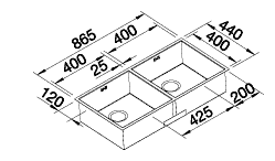Decription: Undermount Bowls with 3.5" basket strainer wastes and overflow.Fixing Kit 212 330 Included.Bowl depth: 175/175mmCabinet Width Minimum: 90cmCut out size: 825 x 400